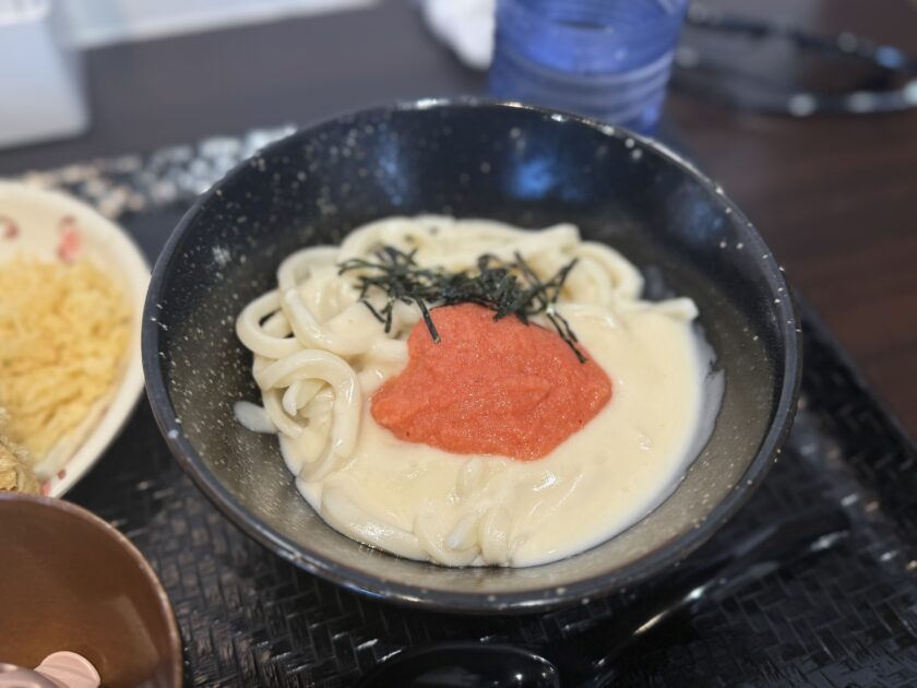 今回もクリーム明太子うどん。安定ですね👍天ぷらはちくわ天を頂きました🙌