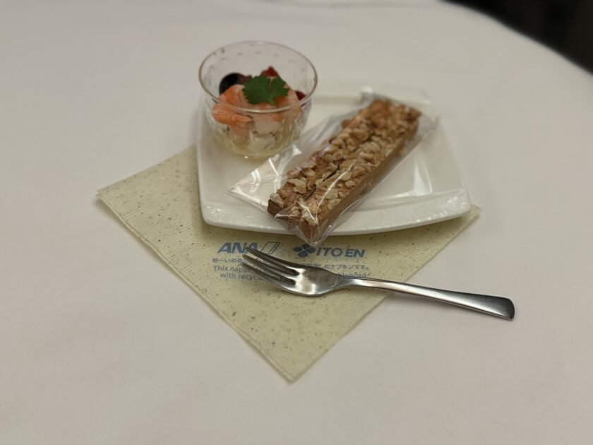 まずANAオリジナルシナモンジンジャースティックにエビのマリネオリーブとチーズです。