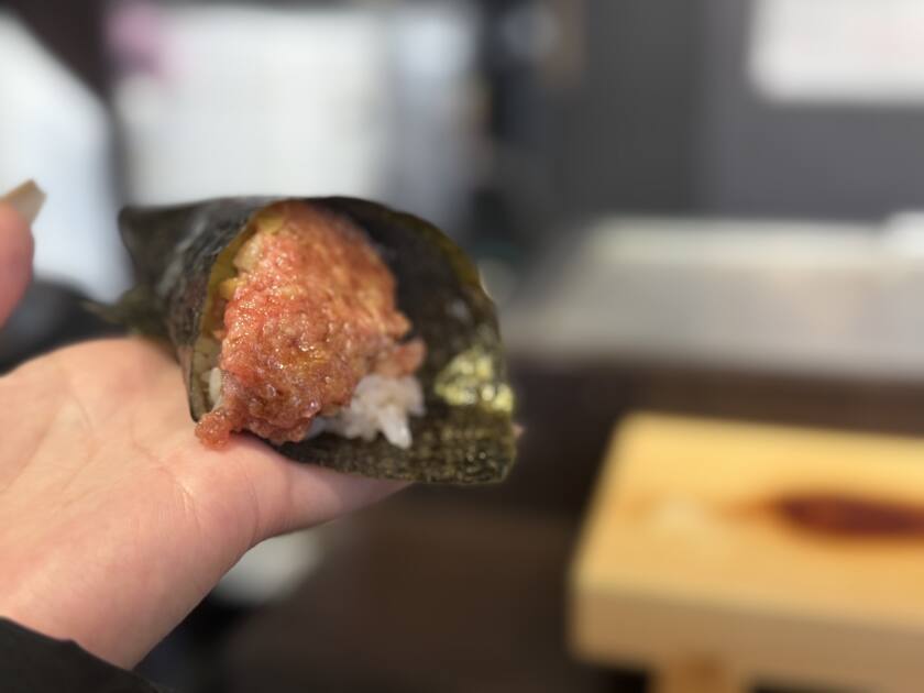 お寿司🍣 投稿者:ブログ担当 投稿日:2026年3月18日 カテゴリー:ブログ こんにちは😊 築地食べ歩きの〆はお寿司🍣 . 立ち食い寿司です せっかくなのでビールを頂きました🍺 1人の店員さんが目の前で握ってくれるのですがとっても優しい方でたくさん話しました😂 . 中トロにサーモンです✨ 決して安くはないですがとろける美味しさでした!! . 最後に最近ハマってるトロタクを頼みました 細巻きかと思いきや手巻きスタイルでしたがこれが1番美味しかったです❣️ . 学生に優しいお値段です 立って食べるお寿司がまた良いですね🤭 . 海鮮🦪 スタバ☕️